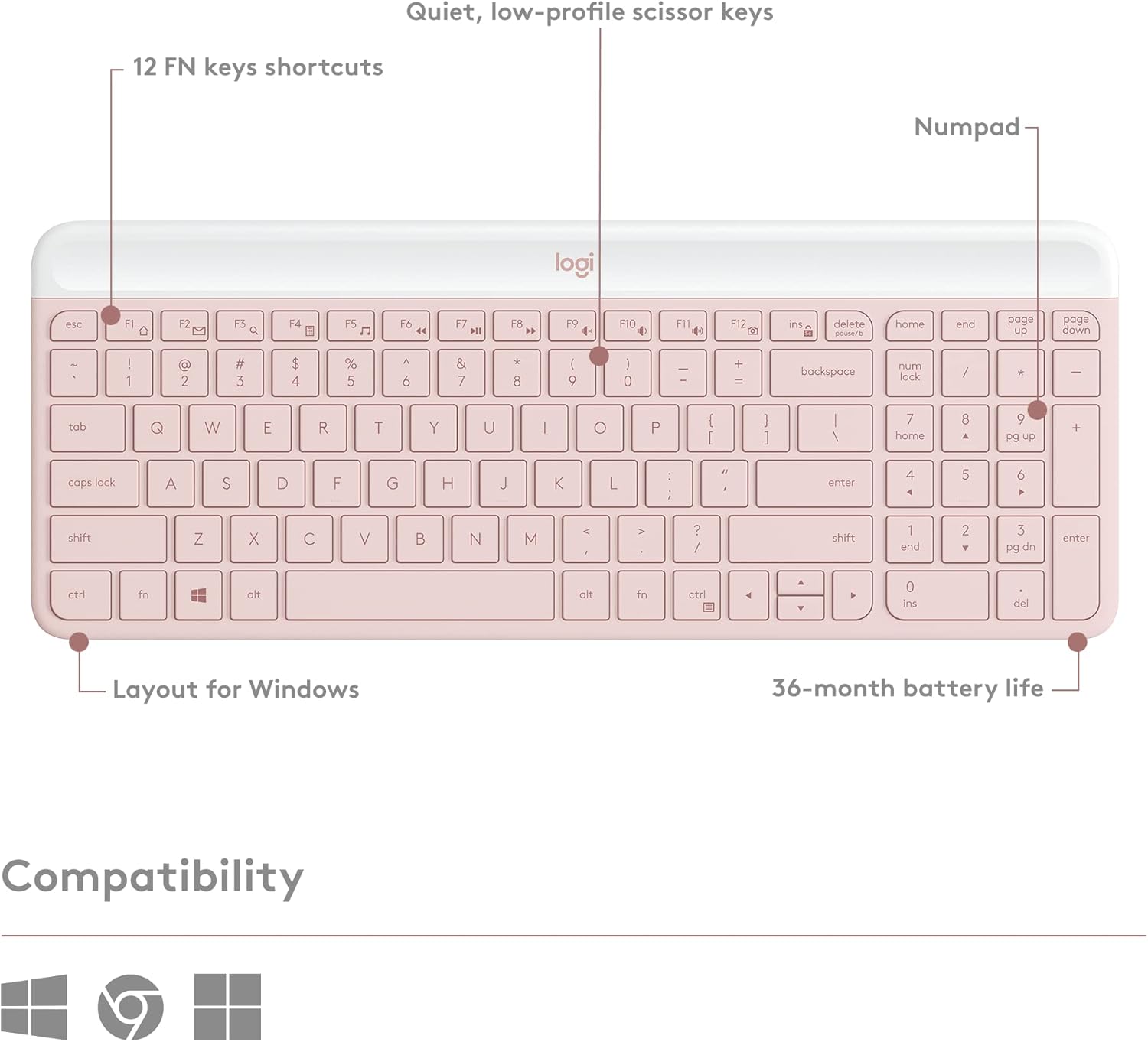 Logitech MK470 Slim Wireless Keyboard and Mouse Combo - Modern Compact Layout, Ultra Quiet, 2.4 GHz USB Receiver, Plug n' Play Connectivity, Compatible with Windows - Rose